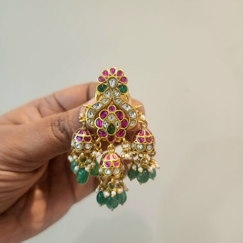 Dual peacock motifs three layered jadau jumkha