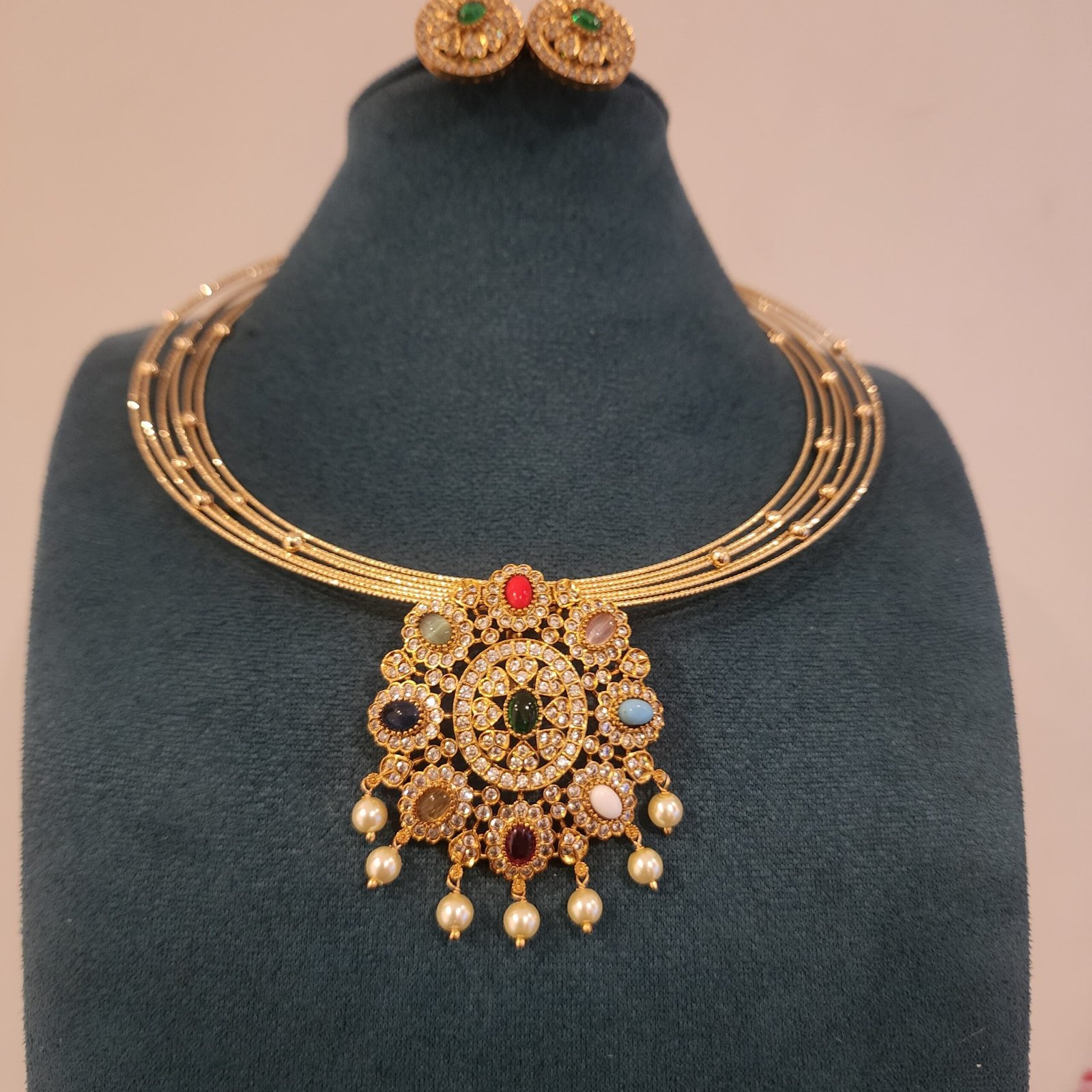 Home Necklaces Hasli & Chains Navaratan pendant set with layered hasli